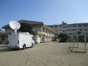 6月14日、今津小学校に朝早くテレビ局の中継車がやってきました。