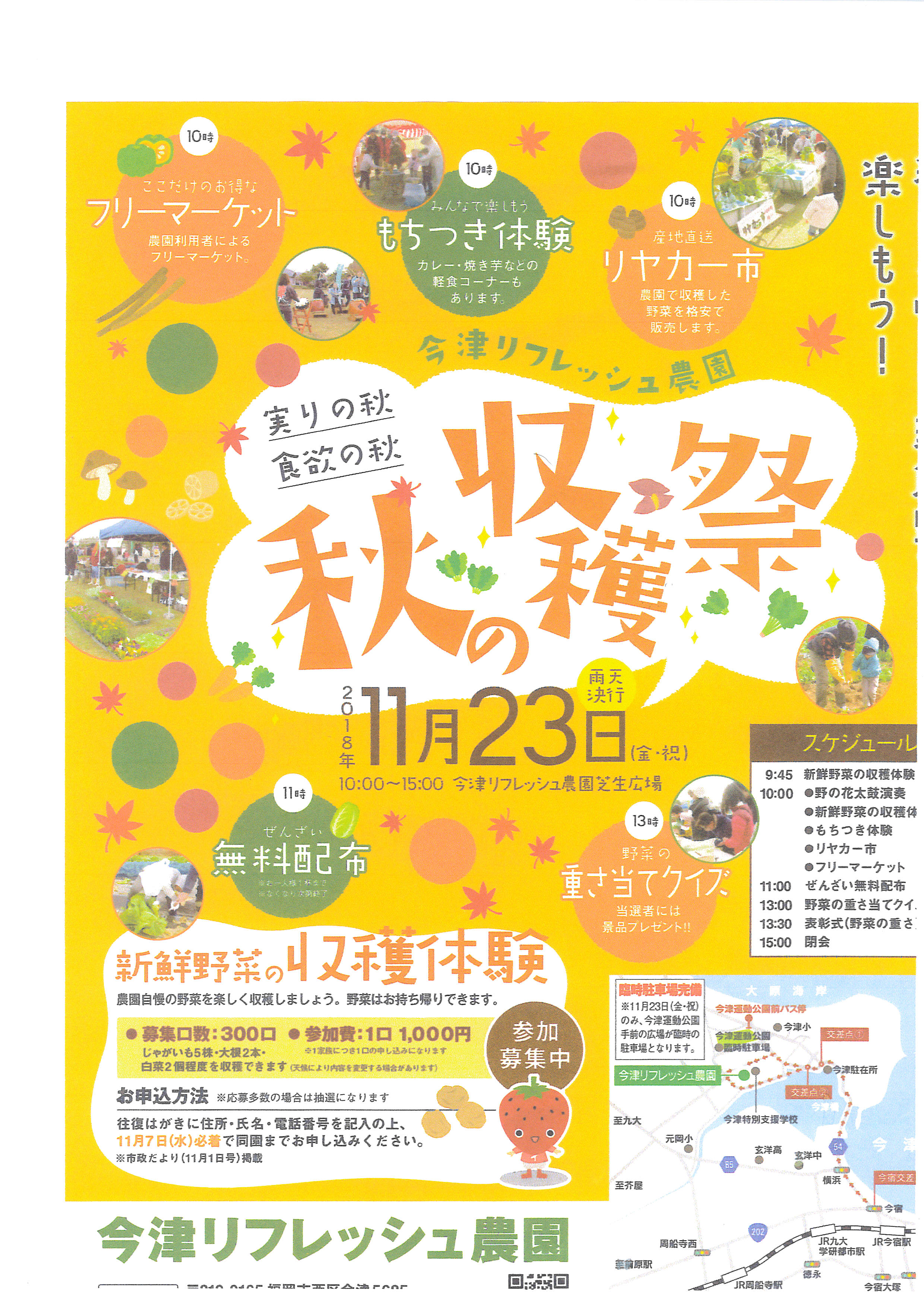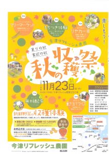 秋の収穫祭のお知らせ お知らせ 2018.11.08 11月23日、午前10時から午後3時まで、今津リフレッシュ農園で「秋の収穫祭」が行われます。内容はフリーマーケット・餅つき体験・リヤカー市などです。詳しくはチラシをご覧ください。