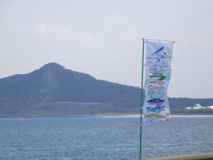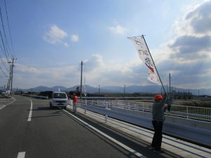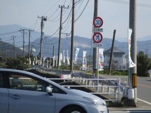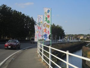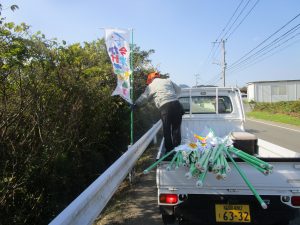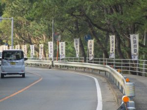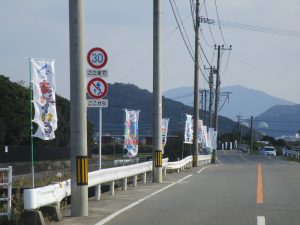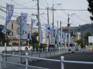 歓迎のぼり旗設置。今津小学校児童作成の旗もたくさんあります。☟