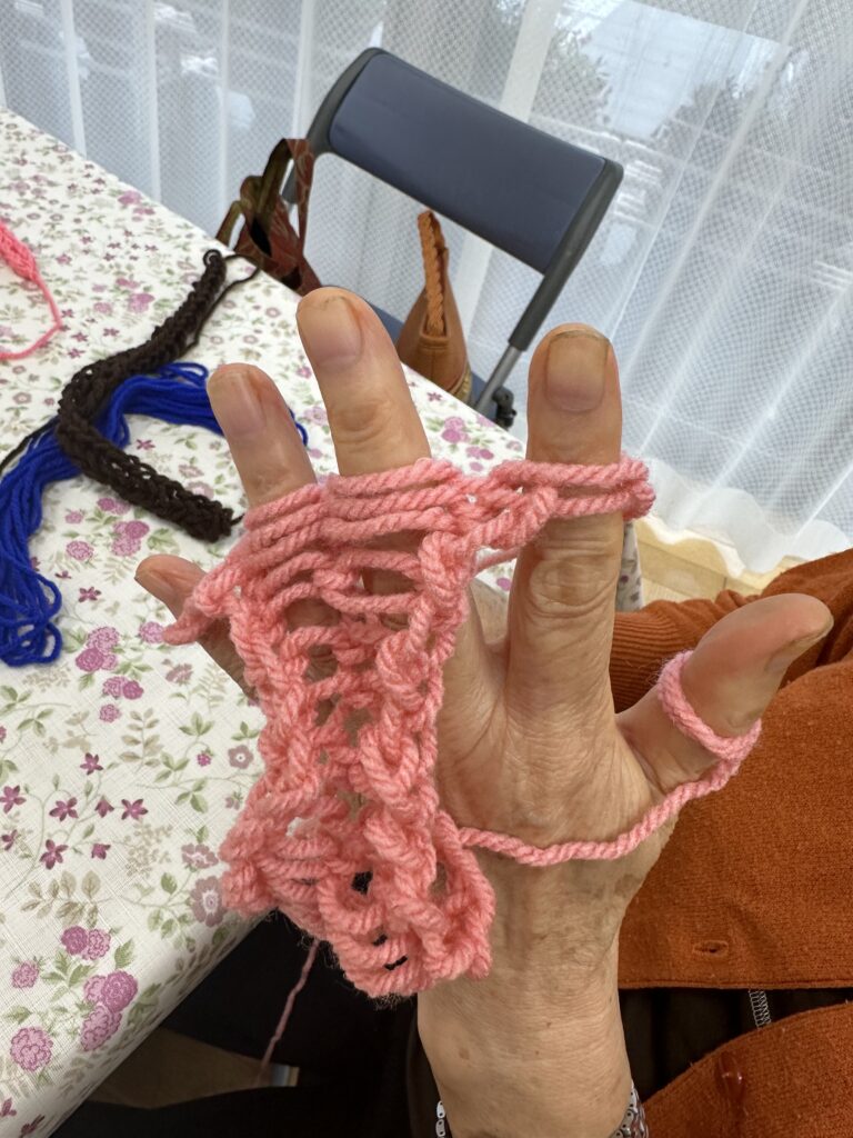 参加者に材料を渡し、「アクリルたわし」作りが始まりました。皆さん、今津赤十字病院スタッフの支援で、素敵なたわしが出来上がりました。