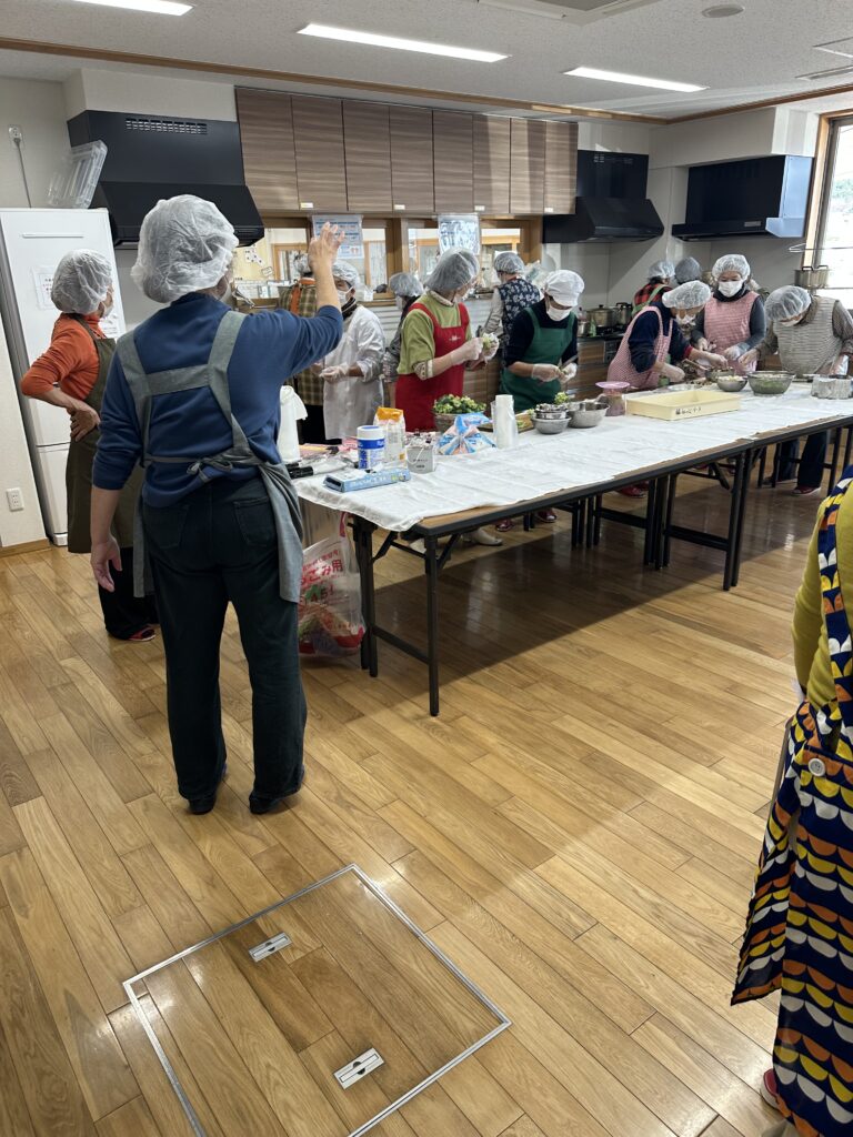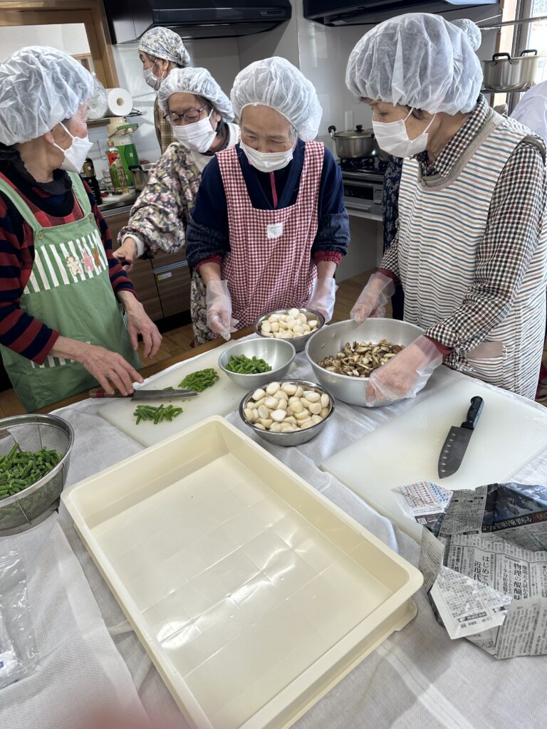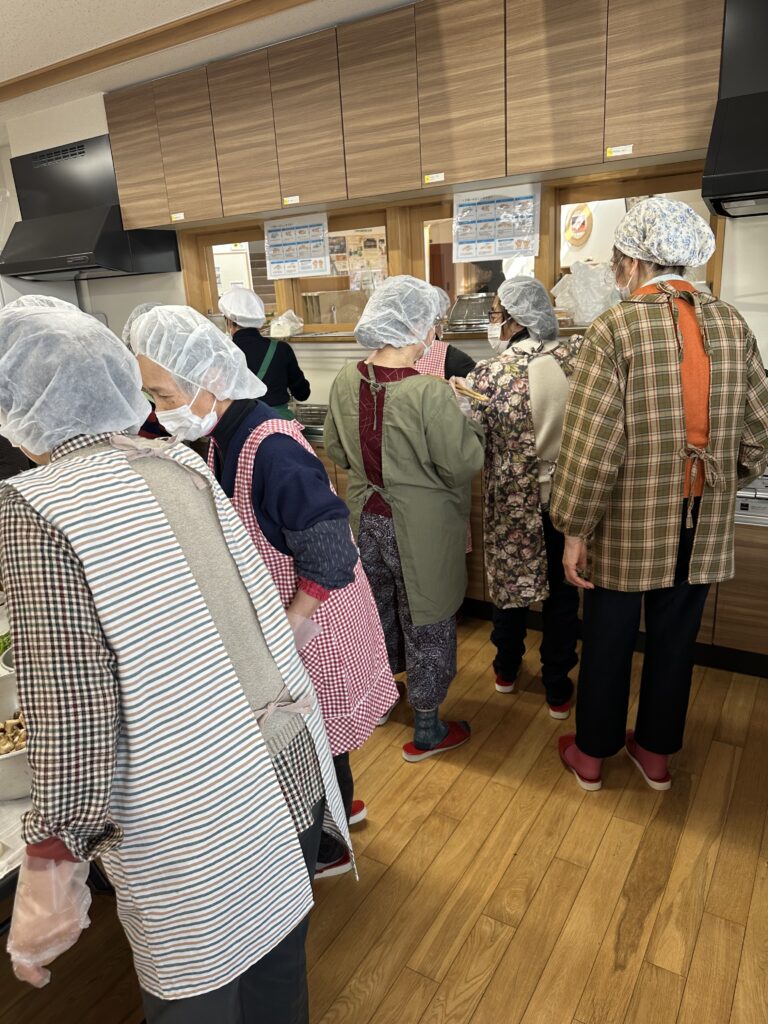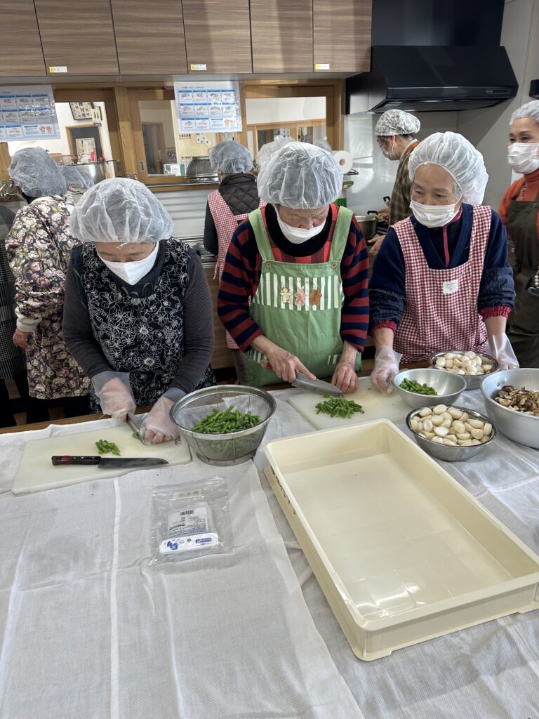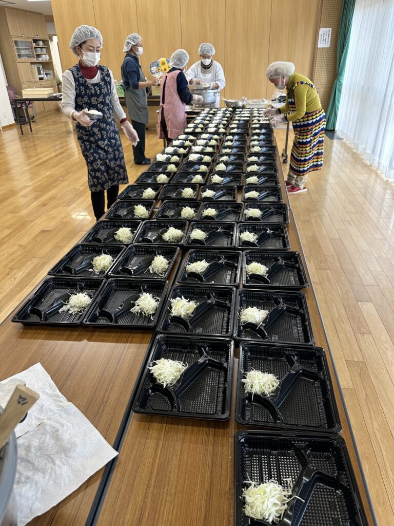 この福祉配食事業は、校区内の概ね75歳以上の一人暮らしの方・高齢夫婦世帯の方・障がいのある方などに手作りのお弁当を届けようと、年間を通して今津福祉村で行われているものです。