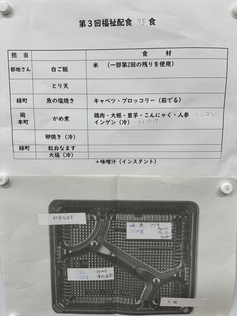 一方、弁当の配達は地域民生委員と老人会役員が担っています。一人暮らしの方・高齢夫婦世帯の方・障がいのある方などに声掛けをしながら弁当を配っています。民生委員の方は「配食お知らせの手紙を持っていくと、『まあ、うれしい。楽しみです。』『この前のハンバーグとってもおいしかったです』『生きる源になります』など、うれしいお言葉をいただき、配達する私達も幸せな気持ちになります。」「ボランティアなぎさの方々のことも皆さんにお伝えしています。」と仰っています。