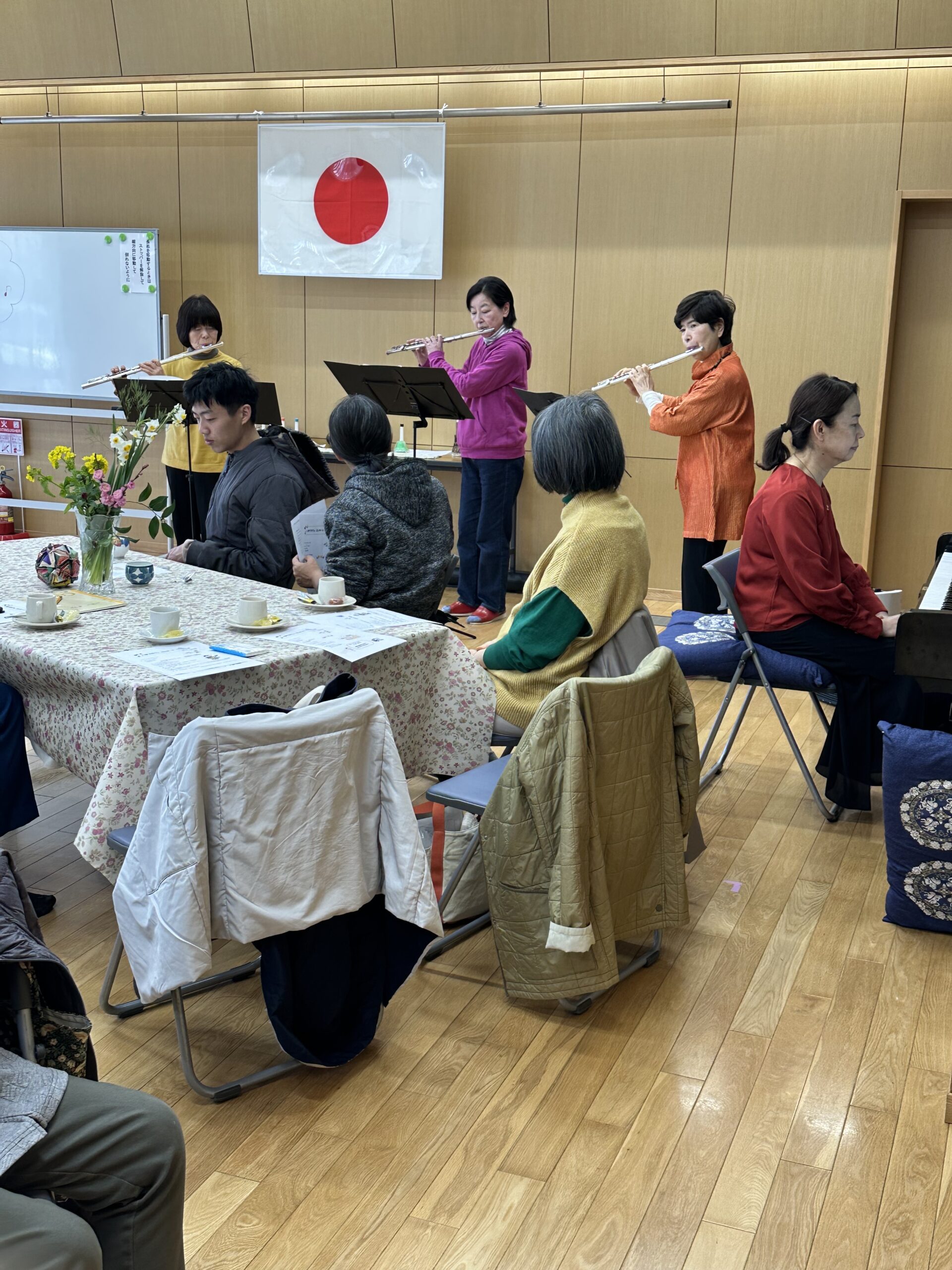 今日のゲストは、フルートアンサンブル「クッキーズ」さんで、30人以上のお客さんがホールに集まり、美しい生演奏を聴いたり、フルートに合わせた手遊びをしたり、歌を歌ったりしました。